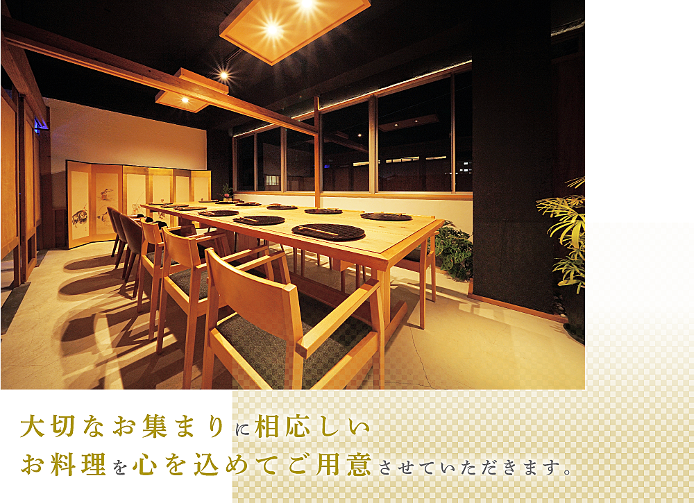 ご予算、ご人数、用途をお伝えいただければ、ご希望に適した、心よりのおもてなしをいたします。