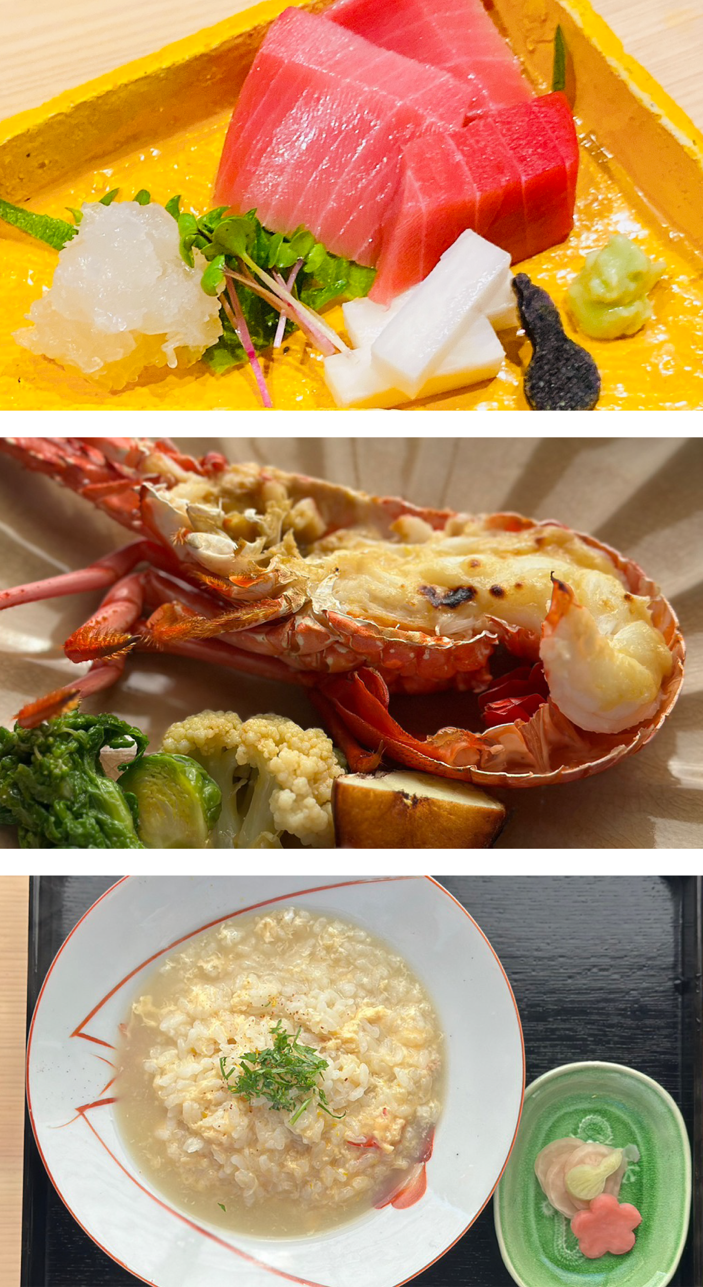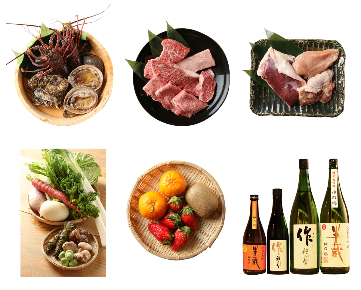 伊勢海老に松阪牛、アワビ、新鮮な果物や野菜。